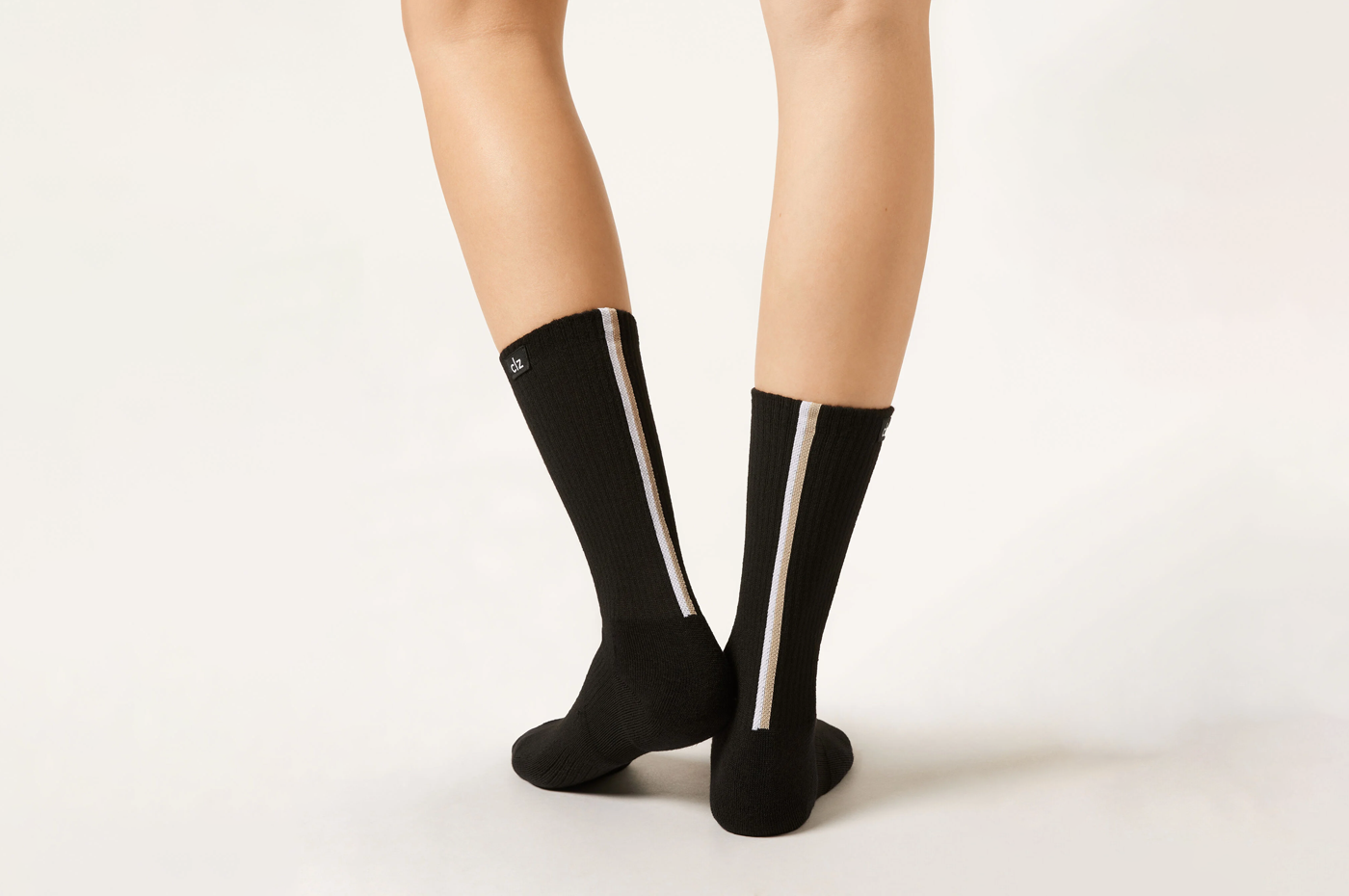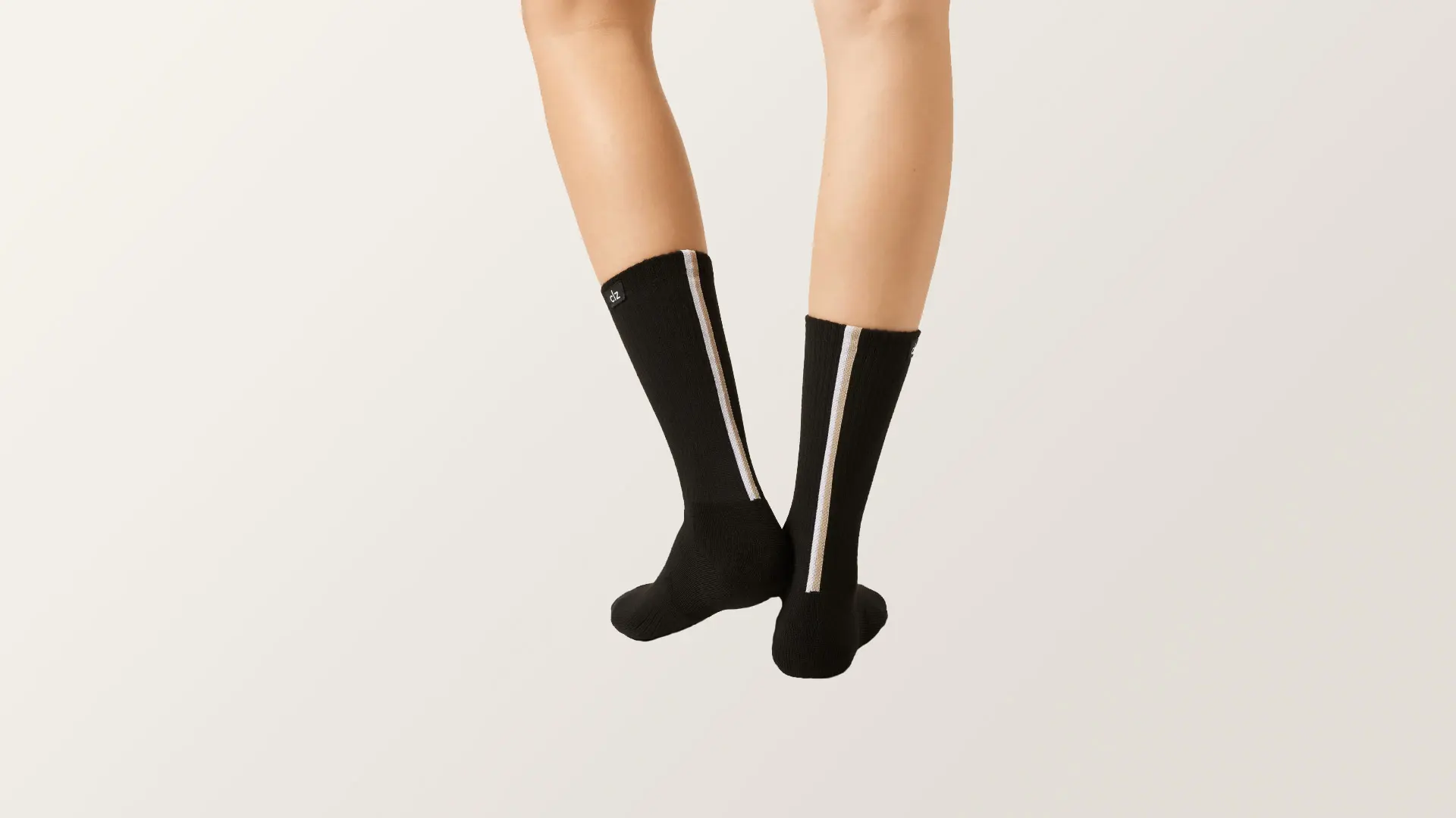 Both pairs are cooling and breathable, thanks to COOLMAX® fiber, and available in two styles: ankle-length Non-Slip Pilates Socks with grip dots, in black and mocha, and calf-height Trekking Socks in four colorways with retro sports stripe detailing.